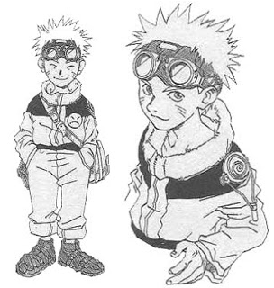 2) No primeiro esboço do personagem, Naruto usava botas ao invés de sandálias, um óculos de aviador ao invés de uma bandana e um cabelo bagunçado. Ele é de uma outra história de Kishimoto, mas como o criador gostou do personagem, acabou usando-o novamente; porém, com algumas modificações…