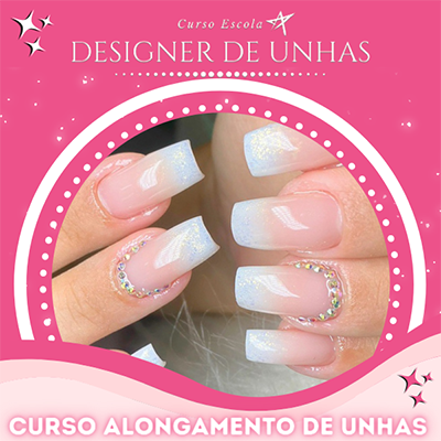 Este curso da Escola Designer de Unhas, promete mostrar todo o passo a passo dos diferente tipos de alongamentos em unhas, tais como, o alongamento em fibra, em gel moldado ou tips. Além disso, ensina a fazer 4 tipos de lixamentos (stiletto, amendoado…) e diversos tipos de técnicas em decoração fixa (baby boomer, encapsuladas com flor seca, tipos de francesas, chuva de glitter).