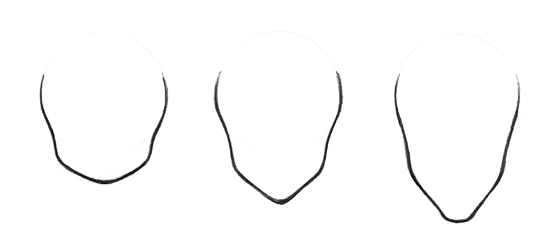O queixo pontiagudo e arredondado, com certeza é outra característica predominante no estilo. Assim as linhas suaves e simples, ajudam reduzir o número de detalhes do rosto, tornando o limpo. Os principais formatos de rostos que você irá encontrar, são como nos três exemplos abaixo, sendo que no primeiro está mais relacionado com o gênero kodomo, o segundo com o Shoujo, e o terceiro com o Shonen. Mas há algumas misturas realizadas por alguns mangakás.