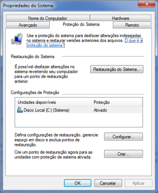 Iniciar > Painel de controle > Sistema e Segurança > Sistema > Proteção do Sistema