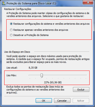 Caso já estiver habilitado uma das duas primeiras opções e sua tentativa de restaurar o arquivo falhe, é sinal que seu computador atingiu o limite de uso para proteção antes de ter criado ou editado tal arquivo; por isso, tente aumentar o espaço antes querer que tal recurso funcione corretamente.
