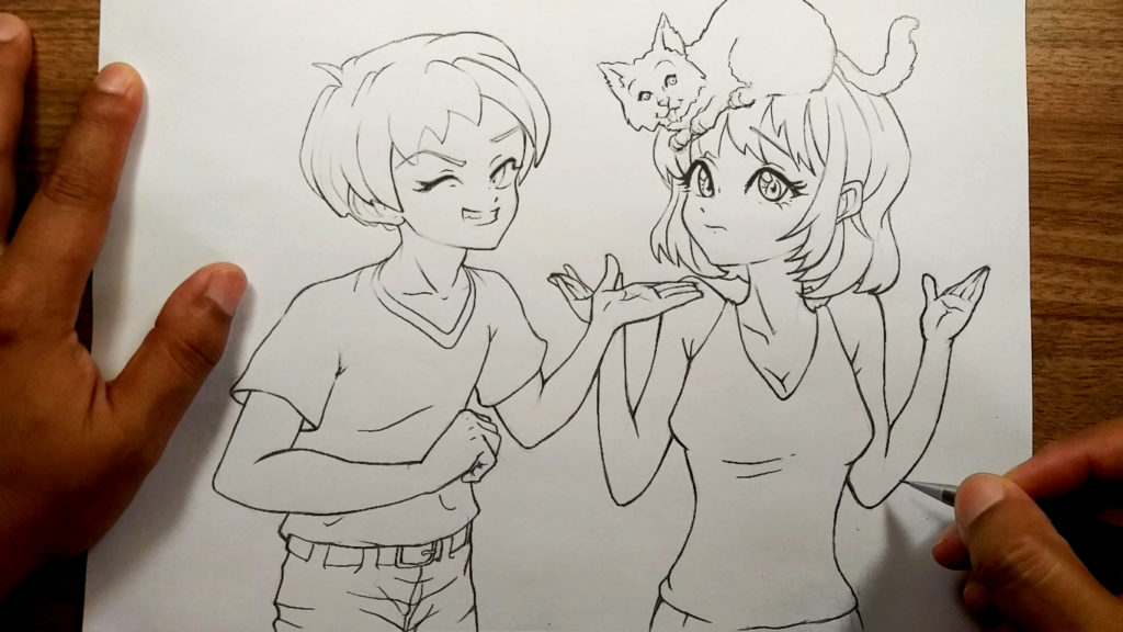 Nessa etapa você irá realizar os contornos com algum marcador, e apagar em seguida o lápis que serviu de esboço. Aqui você irá tomar mais cuidado para criar os traços definitivos se for um desenho estilizado.