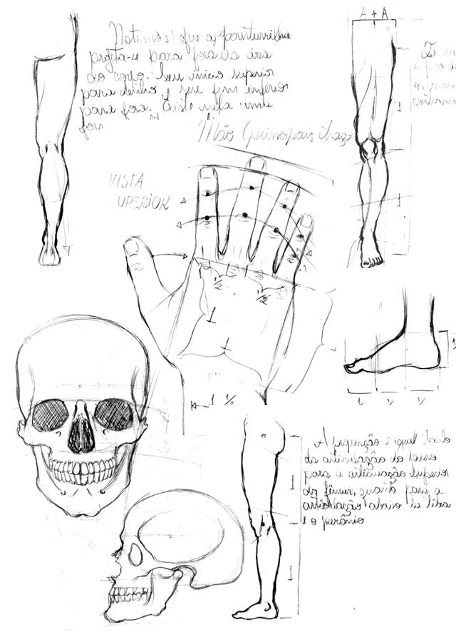 Veja que, uma cabeça humana pode inicialmente virar uma forma oval, um pé ou mão podem virar um trapézio, entre outras possibilidade que você pode escolher; pois o importante é sintetizar cada parte a uma forma que você entenda. Isso é importante, principalmente para um iniciante, porque a possibilidade de erro é grande, ainda mais se tratando da proporção, que iremos explicar mais a frente. Quem desenha por pequenas partes no início e já coloca os traços finais e fortes, quando errar e precisar apagar, terá borrões, marcas no papel. Enfim, o esboço é uma estimativa que supre nossa dificuldade inicial com a proporção das formas. Se você não tivesse tanto essa dificuldade com a proporção, você seria um Kim Jung Gi, desenharia direto.