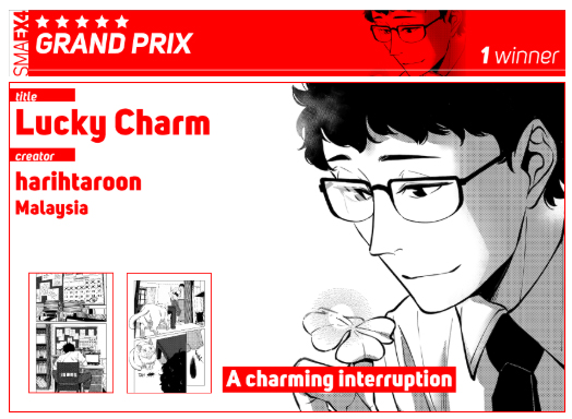 E dessa vez a grande obra vencedora foi Lucky Charm, de Harithtahoon, da Malásia. Com um traço bem fiel ao tradicional mangá, uma narrativa bem conduzida, e história simples, a obra levou todos quesitos em equilíbrio, e provavelmente pontuando bem no julgamento dos jurados.