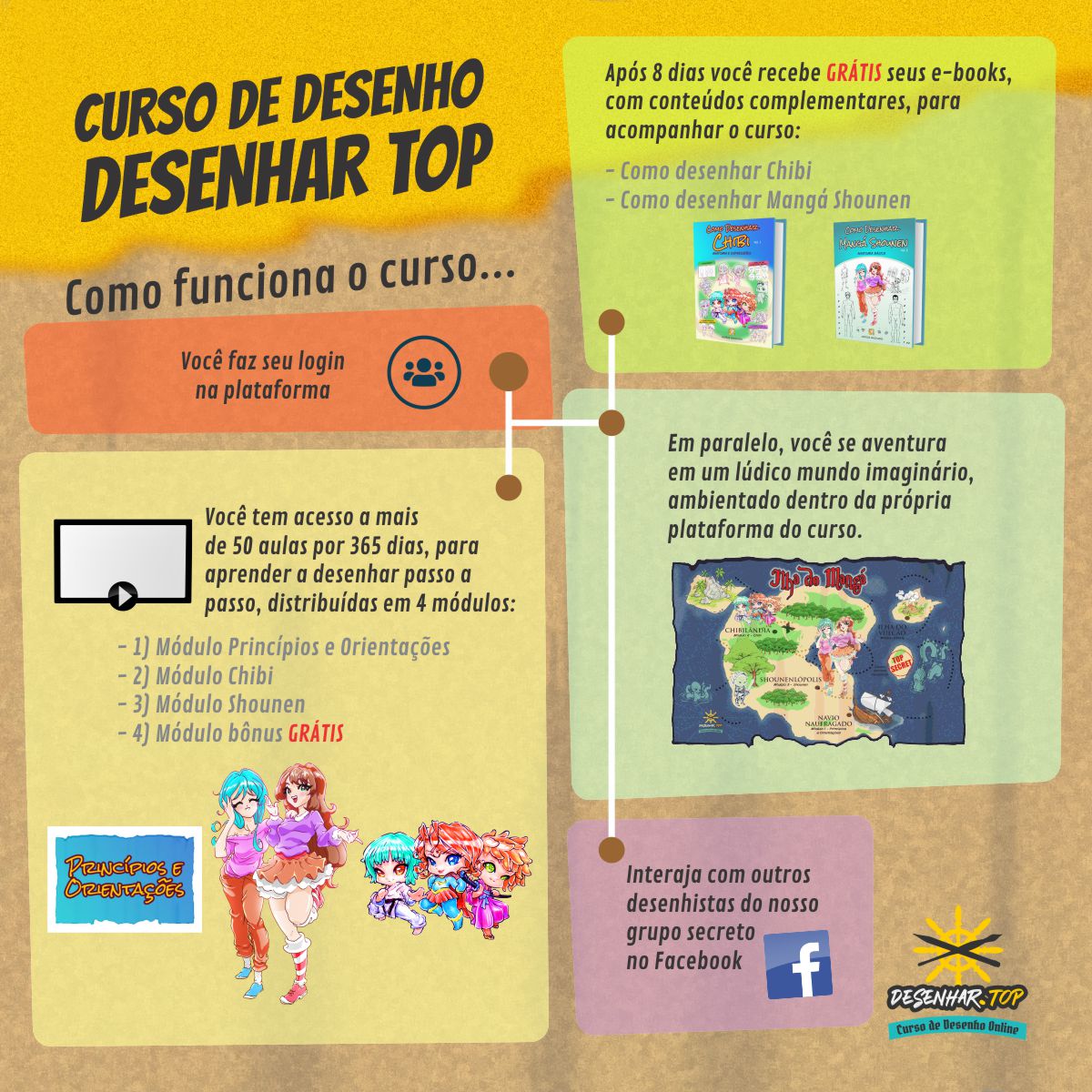 O curso, intitulado como “Desenhar Top – Personagens Mangá” compõe-se de mais de 50 videoaulas e 2 e-books gratuitos, que ensinam a desenhar personagens chibi e shounen.