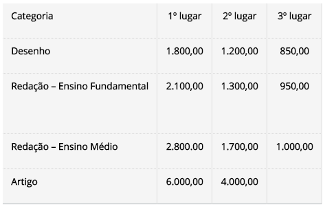 Os estudantes do Ensino Fundamental (1º ao 5º ano) podem concorrer na categoria Desenho trabalhando o tema “Ayrton Senna visita o Museu da Imprensa”. Como forma de incentivo, o professor indicado em cada um dos trabalhos dos alunos vencedores em 1º, 2º e 3º lugares, exceto na categoria Artigo, será premiado com uma caderneta de poupança da Caixa Econômica Federal, no valor de R$ 700,00.