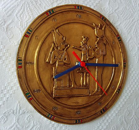 Há algum tempo eu venho tendo algumas idéias de peças artísticas com o tema egípcio. Nesta peça decorativa resolvi combinar a trindade égípcia com um relógio de ponteiros. Os números são algarismos egípcios.