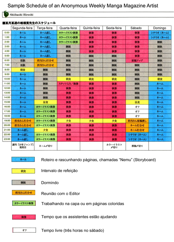 Sobre os detalhes de criação do mangá, vou resumir em poucas palavras. Tudo se resume em reuniões entre editores e mangakás, roteiro, nemu (storyboard), desenhos, arte-final, capas e poucas horas de sono; vou até deixar você novamente com uma agenda do mangaká Shiibashi Hiroshi, autor de “Nurarihyon no Mago”, quem não tinha visto ela vai até se assustar com o ritmo, é puxado demais!