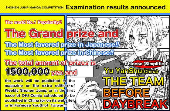 Com a obra “The Team Before Daybreak”, o grande vencedor Yu Yan Shu (China) ganhou o prêmio de popularidade em japonês e chinês, e vai receber um total de prêmios de 1500.000 ienes (14, 3 mil dólares),  além de ter sua obra publicada em uma das edições especiais da Shonen Jump, ou na versão americana da revista, e nas revistas OK! Comic da China ou Formosa Youth de Taiwan.