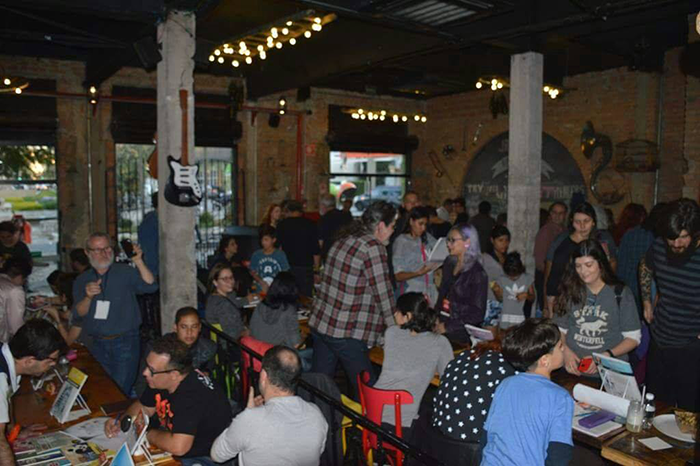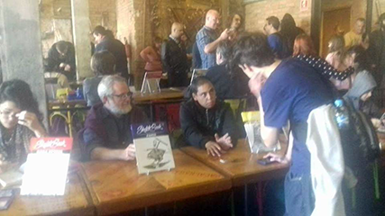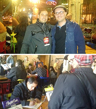 Na entrada eu já tinha reconhecido algumas pessoas que nunca tinha visto pessoalmente mas que sabia quem eram, como foi o caso do diretor de arte Marcial, que logo cumprimentei, e depois o Franco de Rosa, que inclusive já o entrevistei (link entrevista), mas como ele estava trocando ideia com uma turma, preferi esperar um momento mais sossegado para cumprimentá-lo. Ambos muito bem humorados por sinal! O querido Thiago Spyked também estava ao fundo do restaurante, assim logo quando terminei de organizar minhas coisas, fui cumprimentá-lo e até conversarmos um pouco, ele estava organizando seus materiais, preparando-se para o lançamento do seu Post Art. O Sketchbook dele também estava lá. Ele até me entregou uns folders.
