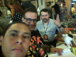 O César é desenhista, animador e criador do ilustre Simão, como diversas publicações pela Editora Globo, Editora Europa, e pela Editora Criativo estava lançando seu Sketchbook e um post art; ele foi muito comunicativo e atencioso. O Fabio super carismático, também é outro grande talento, e tem desenhos publicados pela Marvel Comics, e inclusive estava lá no evento para lançar seu Post Art. Poxa, ele faz os desenhos do Scooby Doo!