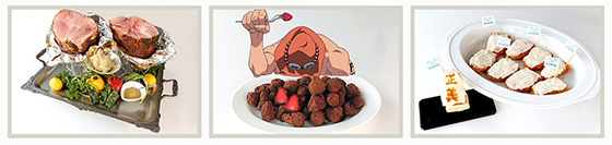 Dentre os pratos, há um pedaço gigante de carne assada com mel dos sonhos de Luffy, morangos com chocolate do deserto e escalopes da justiça.