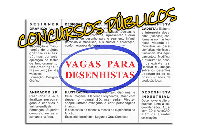 Para quebrar um pouco a rotina, hoje eu resolvi separar um post do Desenho Online para divulgar vagas para desenhistas, dentre alguns dos diversos concursos públicos promovidos pelo Brasil. Se você está procurando uma vaga, talvez dê sorte de encontrar uma chance aí perto de você, confira!